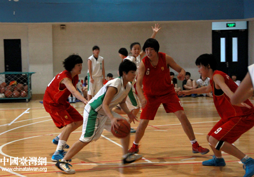 24日下午,北京青年女籃與臺灣臺北女子第一高中女子籃球隊展開一場跨越海峽的友誼賽。圖為雙方隊員在場上激烈爭奪。(中國臺灣網 普燕 攝)