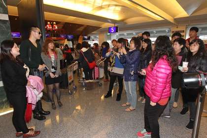李東學搭機前,在機場大廳親切地幫等候已久的粉絲簽名留念,也相當親民,在機場大廳與粉絲合影留念,甚至拿起手機拍起前來送機的粉絲,還帶了相當多的臺灣名產回大陸。(中國臺灣網 焦源源)
