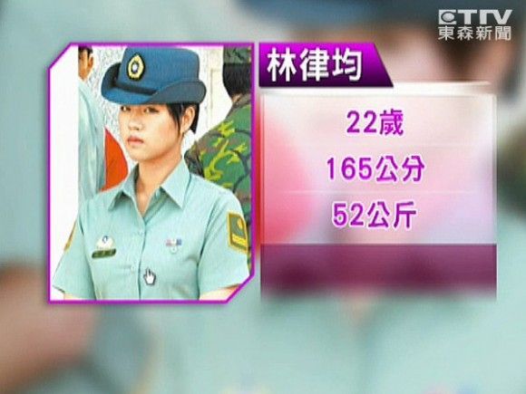 這位戴著軍帽、皮膚白皙的女兵站在司令臺旁,讓人想不注意都難,因為她有張明星臉。這位女兵名叫林律均,今年22歲,身高165公分、體重52公斤,從花蓮家商畢業后入伍從軍,第一次露面就因為長相甜美備受矚目,讓大家差點忘了當天是來參觀美侖營區的。