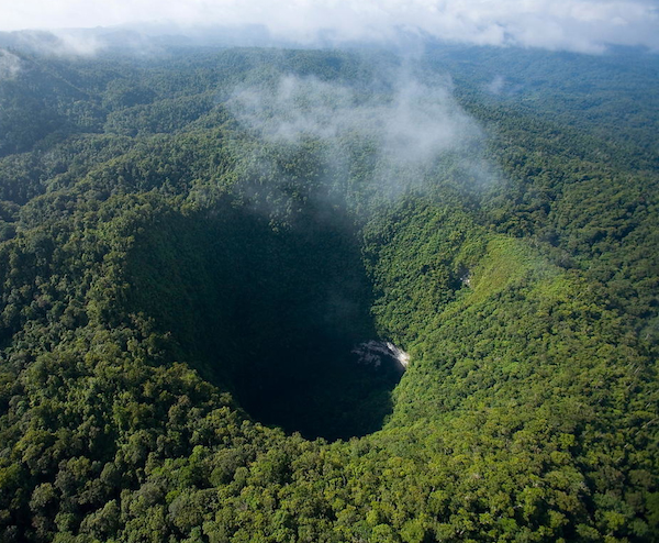 Minyé 天坑寬度達(dá)1148英尺(350米),這意味著四架波音747可以并肩齊驅(qū)橫穿深洞,甚至還能容納第五架飛機(jī)。據(jù)說Minyé天坑是由地下河流與暴雨的沖刷形成的,石灰?guī)r受到侵蝕,導(dǎo)致了地表巖層的倒塌。