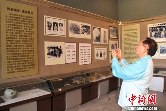 臺(tái)灣新北市體育總會(huì)執(zhí)行長(zhǎng)傅朝華在用手機(jī)拍攝“西安事變 逼蔣抗日”史料。 李芳華 攝