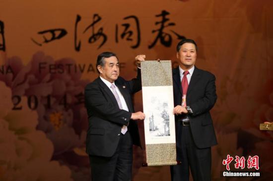 2月9日晚,2014年“文化中國四海同春”亞洲藝術團在東京北千住1010劇場舉行了首演。“文化中國 四海同春”是中國國務院僑辦自2009年春節開始打造的春節系列文化品牌活動。本次亞洲藝術團共在馬來西亞,日本和韓國進行6場演出。圖為亞洲團團長、暨南大學校長胡軍向東京華僑總會會長廖雅彥贈送紀念品。中新社發 高越 攝