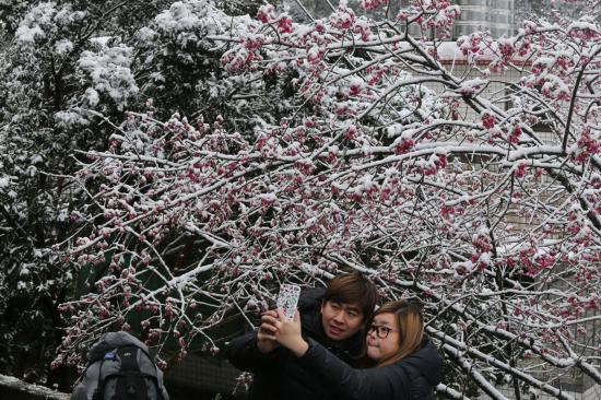 臺北市陽明山24日積雪深厚,一棵盛開的櫻花被白雪覆蓋,民眾拿起手機自拍留念。