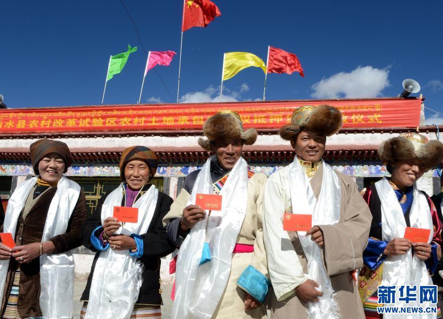 西藏拉薩市曲水縣才納鄉白堆村農民展示貸款證(2015年4月17日攝)。新華社記者 覺果 攝