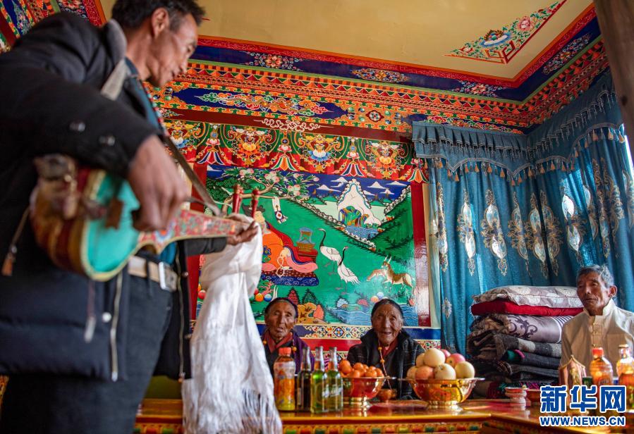 1月14日,在位于嘎吉林村安置點的新家中,村民手拿祈福所用“切瑪”,出門迎客。新華社記者 晉美多吉 攝