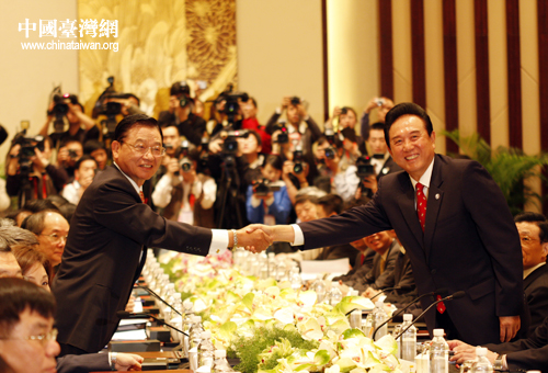 陳云林與江丙坤握手。26日上午,海協會與臺灣;鶗I導人第三次會談在南京紫金山莊會議中心紫金廳舉行。(中國臺灣網 鐘寶華 攝)