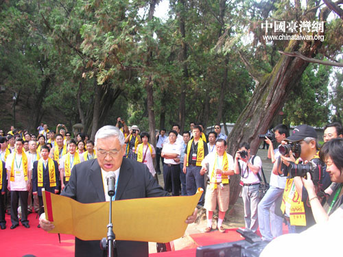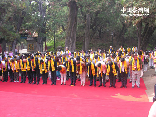 中國臺灣網7月19日陜西黃陵縣消息  7月19日上午,參加“情系長安——兩岸文化聯誼行”活動的160余位兩岸文化界人士,在黃帝陵恭祭軒轅黃帝。臺灣嘉賓團顧問、臺灣世新大學教授、中華民俗藝術基金會董事長曾永義恭讀祭文。以下為祭文全文。
