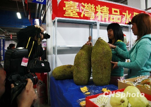 4月26日,在河北正定縣小商品博覽會上,300個家臺企的數(shù)千種商品亮相。在臺灣展區(qū)展銷的水果、小食品、飾品、服裝等特色商品受到游人歡迎。圖為來自寶島臺灣的精品水果“菠蘿蜜”其碩大的體形吸引了媒體的眼球。 中新社發(fā) 翟羽佳
