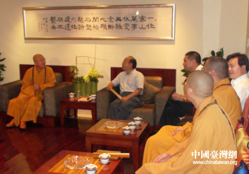 中國臺灣網8月11日舟山消息 8月10日,臺灣中華護僧協會榮譽理事長釋傳孝和南海觀音文教基金會會長吳天池,赴浙江省舟山市普陀山參加了普濟寺道慈大和尚升座法會。期間,與舟山市委副書記、市長周國輝進行了會面,并著重圍繞“千人護千佛、慈航寶島行”為主題的佛教文化交流事宜進行了具體的交流磋商。