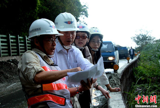 10月25日,海峽兩岸旅游交流協會臺北辦事處主任范貴山(左2)、海峽兩岸旅游交流協會副秘書長李亞瑩(左3)等,來到發生大面積塌方的臺灣蘇花公路114.5公里現場,實地了解相關情況和救援進展。