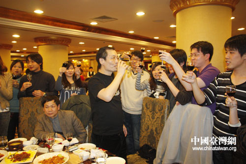 臺(tái)生和閆會(huì)長(zhǎng)把酒言歡。(中國(guó)臺(tái)灣網(wǎng)栗琰攝)