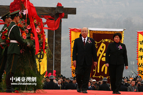 中國臺灣網4月5日西安消息 辛卯年清明公祭軒轅黃帝典禮5日上午在陜西省黃陵縣橋山祭祀大院隆重舉行。中國國民黨榮譽主席吳伯雄和夫人戴美玉應邀參加,并敬獻花籃。(記者 李典典)