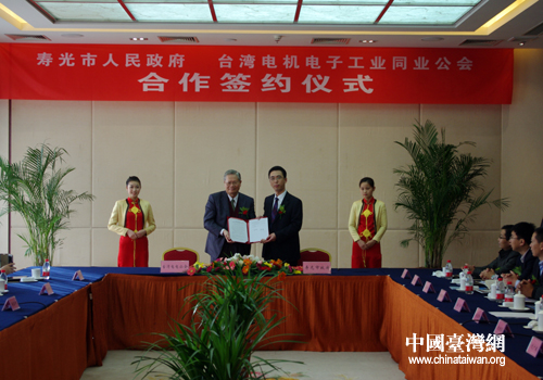 中國臺灣網12月5日壽光消息 12月3日上午,壽光市人民政府—臺灣電機電子工業同業公會合作簽約儀式舉行。臺灣電電公會將協助壽光市建立能源網、運籌網系統,積極開展節能減排,助力壽光市轉型升級。臺灣電電公會秘書長陳文義、市領導趙緒春、劉廣斌出席。