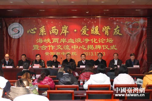 中國(guó)臺(tái)灣網(wǎng)12月17日安陽(yáng)消息 日前,“海峽兩岸血液凈化論壇暨合作交流中心揭牌儀式”在安陽(yáng)市中醫(yī)院舉行。安陽(yáng)市政府副秘書長(zhǎng)趙世輝、市衛(wèi)生局局長(zhǎng)宋先忠,臺(tái)北市政府衛(wèi)生局副局長(zhǎng)、醫(yī)學(xué)博士陳南松,等出席揭牌儀式。安陽(yáng)市中醫(yī)院60余位醫(yī)護(hù)人員參加了揭牌儀式。