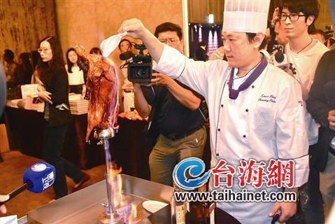 有意思的是,活動現場一邊是“理論派”美食家侃侃而談,一邊是大廚或商家們展示各地創意美食。臺灣君品酒店副主廚簡敏宏現場展示了火焰片皮鴨的制作,當鴨子淋上君度橙酒點燃跳躍著藍色火光時,全新視覺體驗,引發陣陣贊嘆聲。