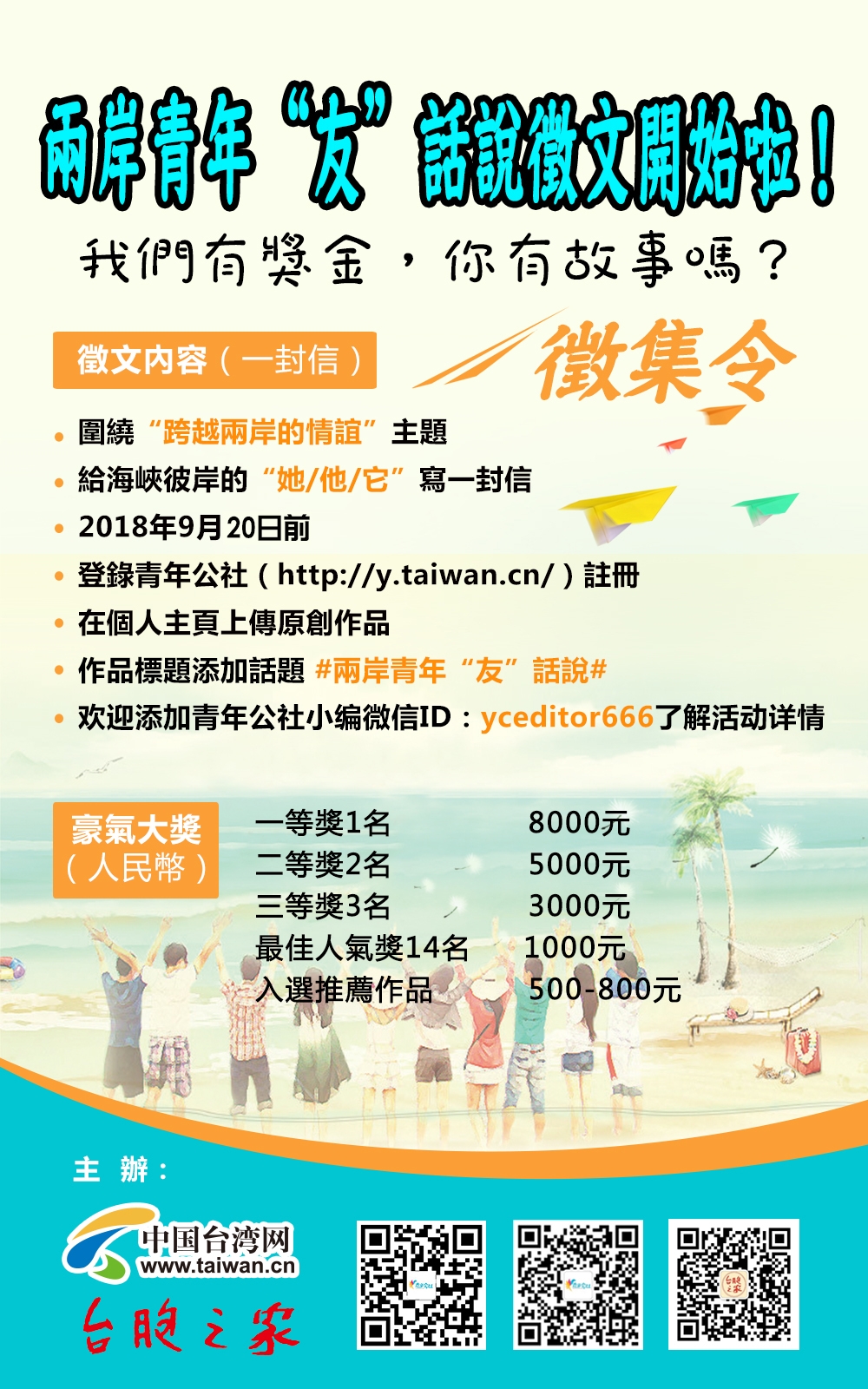 4.投稿過程中遇到問題請聯系青年公社小編,微信(ID:yceditor666),備注參加兩岸青年“友”話說征文活動。