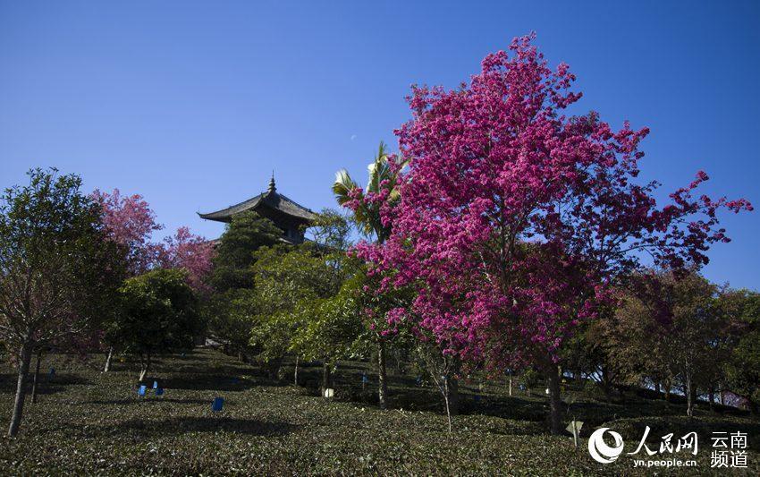 人民網(wǎng)普洱1月9日電(虎遵會(huì))近日,位于云南省普洱市思茅區(qū)的萬(wàn)畝生態(tài)茶園內(nèi),近千棵冬櫻花迎風(fēng)綻放,姹紫嫣紅、美景如畫。(完)