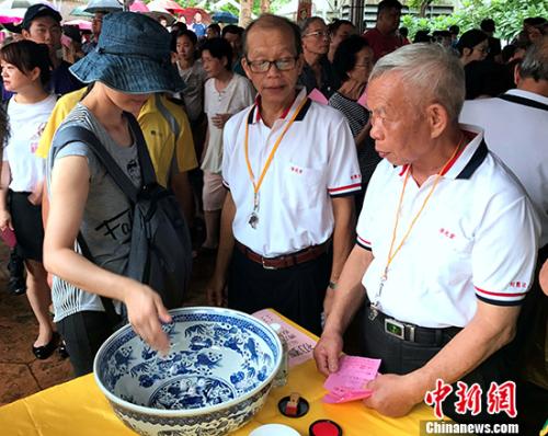 中秋博餅比賽在臺北葫蘆堵海光宮前舉行,參與的人們相繼擲出骰子,期待“中狀元”。(中新社記者 邢利宇 攝)