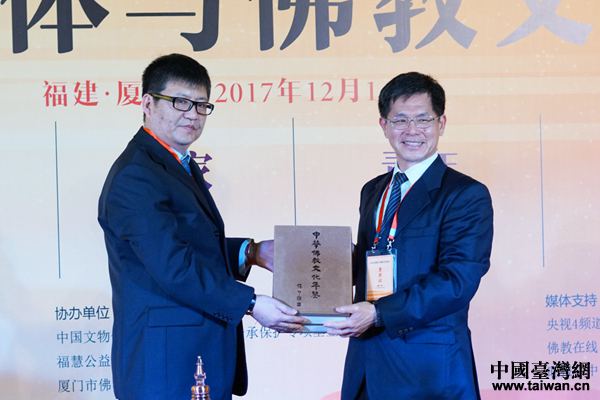 九州音像出版公司副總裁冀小東先生為中華慈濟大學贈《中化佛教文化年鑒》。(中國臺灣網(wǎng) 張玲 攝)