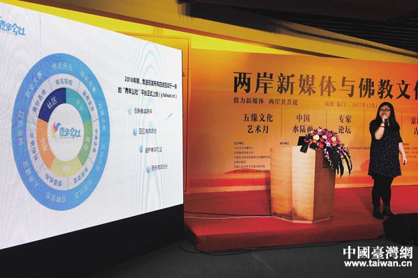 兩岸嘉賓圍繞“兩岸新媒體與佛教文化論壇之兩岸佛教文化的新媒體表達”和“兩岸新媒體與佛教文化論壇之青年公社打拼兩岸文化原創(chuàng)力”兩大專題進行了深入的探討和交流,圍繞新時代、新媒體視角下佛教文化傳播的轉型升級,青年參與兩岸文化原創(chuàng)力的創(chuàng)新趨勢等發(fā)表主題演講。其中,中國臺灣網(wǎng)記者張玲介紹了兩岸青年交流平臺“青年公社”。