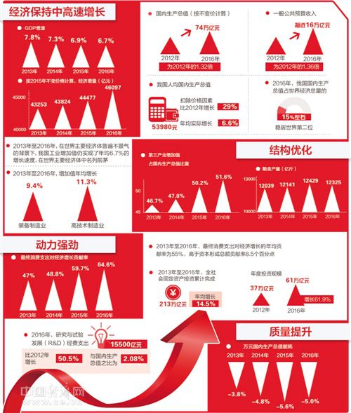 GDP年均增速7.2%,高于同期世界2.5%和發(fā)展中經(jīng)濟(jì)體4%的平均增長水平;CPI年均上漲2.0%,低于年度漲幅預(yù)期調(diào)控目標(biāo);城鎮(zhèn)新增就業(yè)連續(xù)四年保持在1300萬人以上,31個大城市城鎮(zhèn)調(diào)查失業(yè)率基本穩(wěn)定在5%左右……這些有溫度的數(shù)據(jù),記錄著我國在2013年至2016年間取得的輝煌成績。