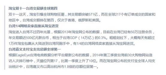 先拿最簡單的網購來說:當某寶剛剛進入到臺灣省時,不論是人性化的購物體驗還是精細化分的購物選擇,都比臺灣當地充斥著亂七八糟廣告的網購平臺強很多,但有些臺灣同胞們嘴上說著不要,可身體卻很誠實的在某寶上瘋狂網購。