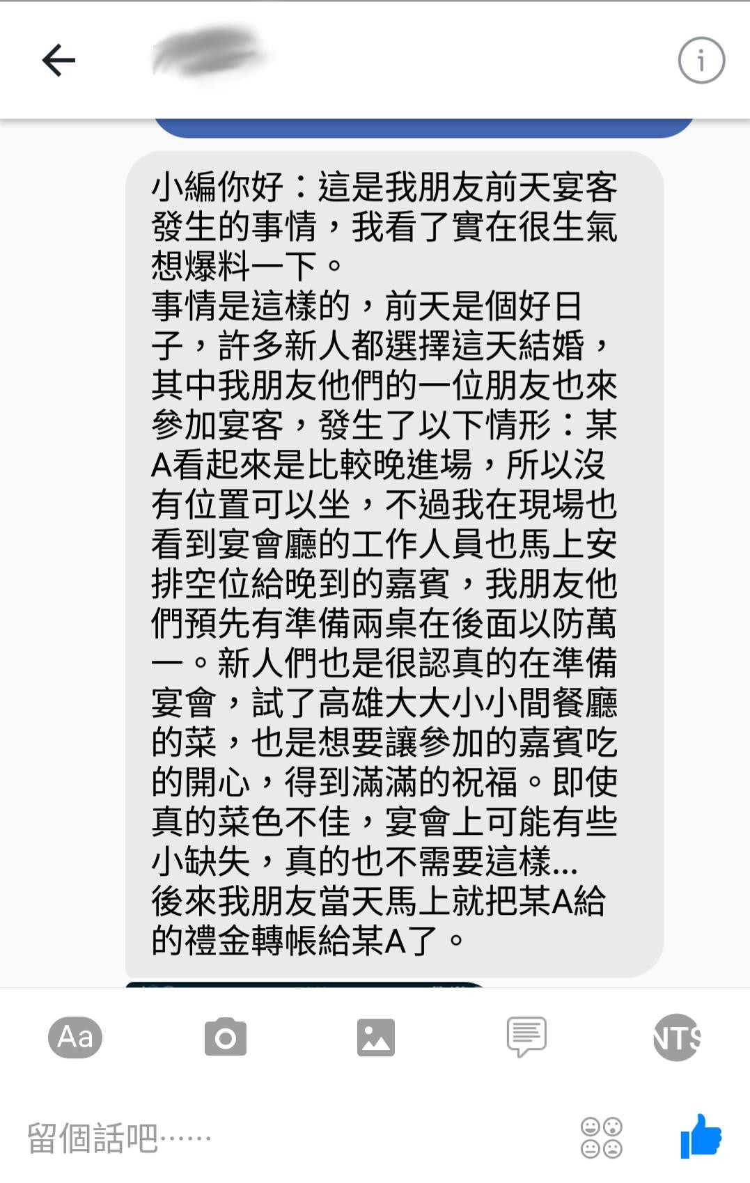 據悉,某A在婚禮的當下便傳訊息給新郎吐槽,“掉漆耶你,沒位置又不好吃,沒用心”,隔天接著又說,“你最好以后對我們厚道一點,做人踏實一點,為人敦厚穩重,以后的路跟人脈才會長久。你要多多出席大場面,見多識廣,就會懂了”,之后更加碼說“昨天的場真的很丟人”。新郎忍不住嗆聲“丟不丟人不是你說的算,如果不OK,我錢還你”,沒想只過一分鐘,某A竟真的貼出了銀行存折帳號!