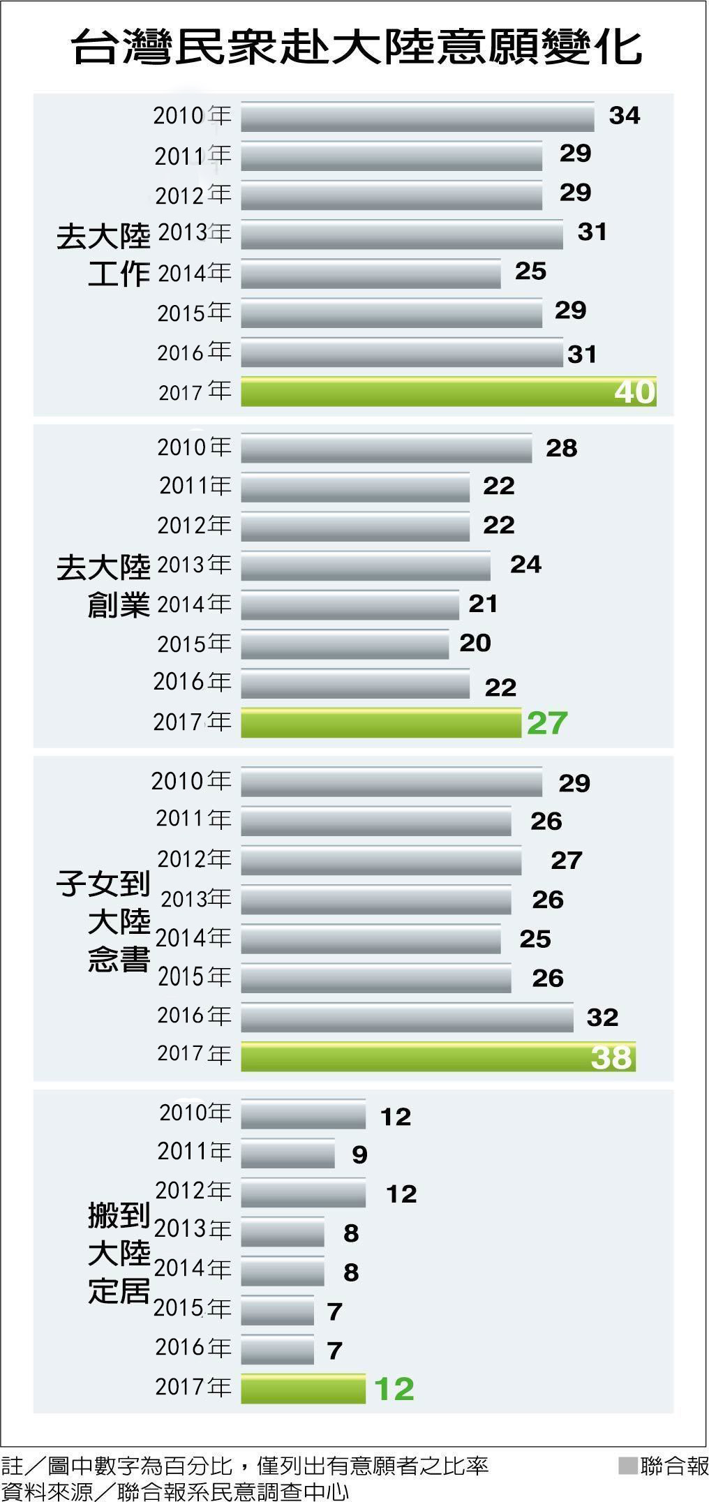說到這兒,不知道大家還記不記得之前《聯合報》做的“兩岸關系年度大調查”,當時的結果顯示在兩岸趨勢上,有四成臺灣民眾愿意赴大陸就業,較去年大幅增加九個百分點,其中30歲以下年輕人的“西進”意愿由去年的三成增為五成三;另有三成八的家長愿意讓孩子去大陸念書,這也創了八年來的新高點。