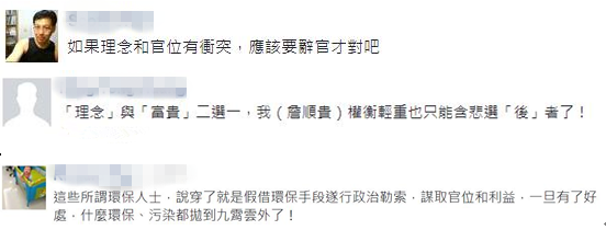 據臺灣“聯合報”報道,近日,臺灣“環保署副署長”詹順貴14日于環評大會中投下關鍵一票,讓深澳電廠環評修正通過一事在臺灣鬧得沸沸揚揚,引發北部六縣市反彈,以及環保人士的集體抗議。這位從前的“環保斗士”的“驚天一投”讓昔日的戰友都深感被背叛,還稱“個人喜好不能凌駕‘法律’”更被網友諷刺:“如今換了位子就換了腦袋”。