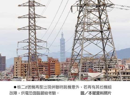 核二2號機再度出現并聯時跳機意外,若再有其他機組故障,供電恐面臨嚴峻考驗。(圖片來源:臺灣《工商時報》)