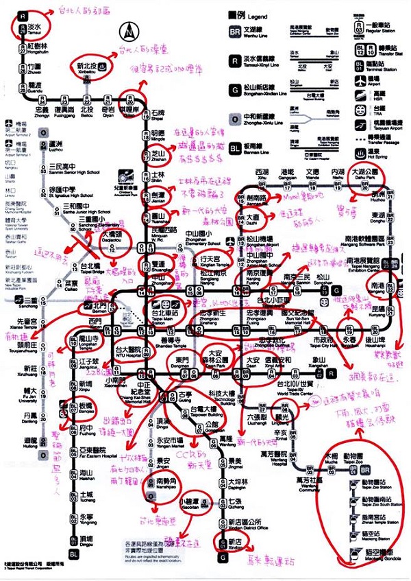 報道說,一名在臺北就讀大學(xué)3年的臺中網(wǎng)友,根據(jù)臺北捷運沿線整理各站著名景點。臺北車站是“迷宮,外地人出不去”、劍潭“士林夜市在這里,不要被騙了”、新北投“臺北人的澡堂”、淡水“臺北人的郊區(qū)”、龍山寺“可拜月老”、中正紀念堂“出錯出口得繞一大圈”、板橋“圣誕節(jié)超多人”等等。
