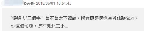 段宜康的這番“邊緣人”言論還沒等到呂秀蓮親自回應(yīng),網(wǎng)友們就看不下去了:“曾經(jīng)與這種人同黨還真倒霉”“有本事不要待在不分區(qū)”“人家邊緣至少還能當(dāng)副‘總統(tǒng)’,不像你自己其實(shí)邊緣到個(gè)極致,只能發(fā)個(gè)廢文”“你的曲棍球呢?”“支持段宜康=支持姚文智=支持民進(jìn)黨”“做人總比做畜牲好”“要不要吞曲棍球。”