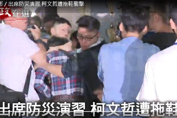 柯文哲出席防災演習遭拖鞋襲擊,場面混亂。(圖片截取自臺灣《聯合報》)