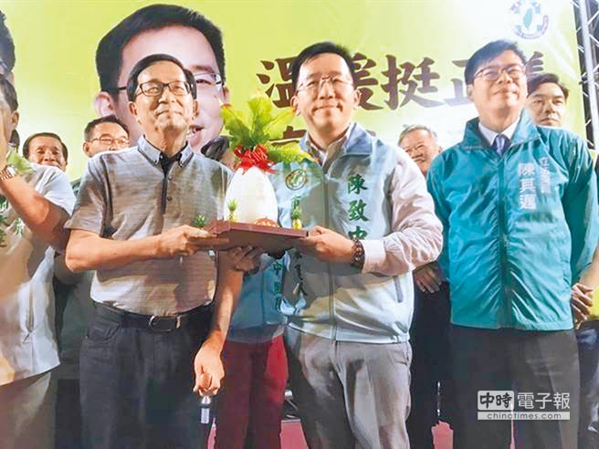 陳水扁決定10月28日為陳致中站臺,“已有被抓回去的最壞打算”。圖為去年扁公開替兒子陳致中(中)助選,送上好彩頭祝福。(圖片來源:臺灣“中時電子報”)