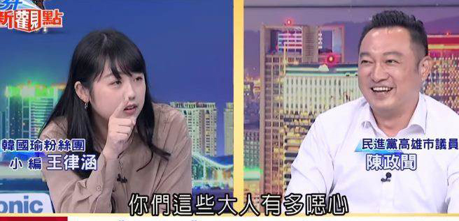 爭論中,綠營政客出言不遜,講出“年輕人可以做錯事不能做壞事”;王律涵不甘示弱回嗆,“是你們這些大人才奇怪吧?我們長大之后,才知道你們這些大人有多惡心”,讓綠營政客聽了唯有尷尬強笑,而一旁的周玉蔻趕忙幫腔,“韓國瑜小弟你不要帶壞年輕人太可惜了”。