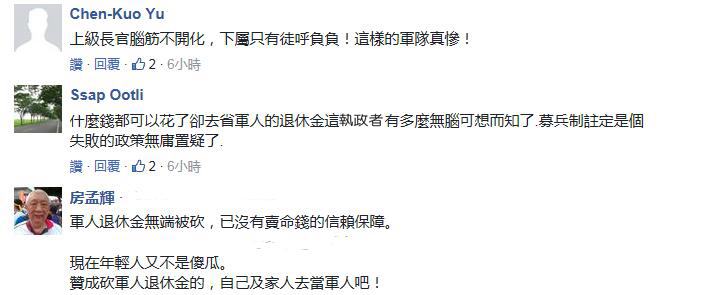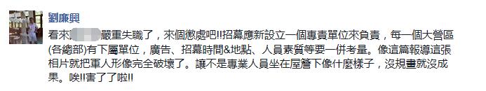 不少看到此圖的網友也有感而發,有人說“這比算命擺攤還可憐”,有人嘆“今天的招募員就是明天的你”,有人道“沒了退休金的保障,募兵制注定失敗”,有人罵“執政黨把軍人貶低成這樣,沒了尊嚴,自然招不到人”,有人盼“國民黨快起來挽救軍人的地位、尊嚴和福利”……當然,也有善良的網友向臺防務部門諫言:招募應由專責單位負責,如此打游擊式的擺攤召募,既無成效也傷臺軍形象。