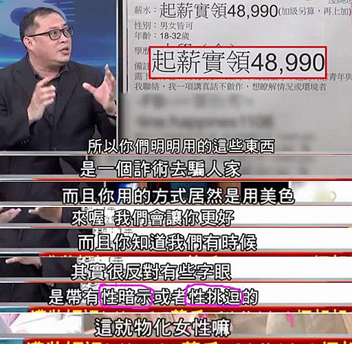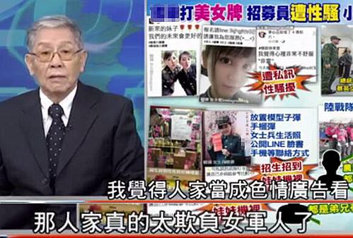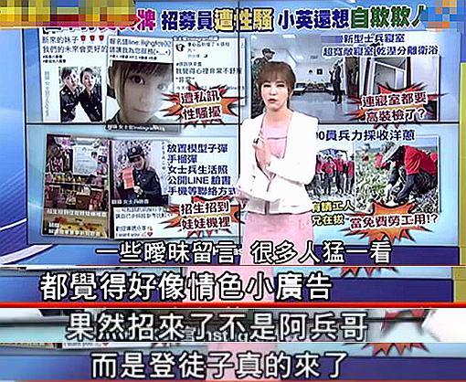 除此之外,就連招個1年期志愿役軍官都得靠將女士官軍裝照與Facebook、line聯絡方式放進夾娃娃機里的做法也讓臺灣政論節目主持人和嘉賓痛批:如此化濃妝、穿短裙,并帶有“性暗示”的招募廣告,不僅是一種“詐騙”更是物化女性的表現,“真的太欺負女軍人了”。