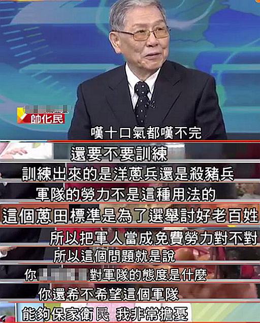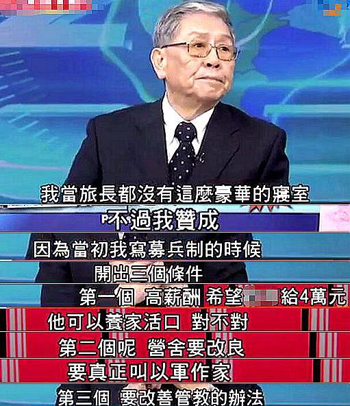 他還直言,自己在當旅長時都沒住過這么豪華的寢室。不過,他隨即表示,如果蔡當局真能把士兵宿舍改成這樣,自己絕對贊成。帥化民還透露,自己當初在寫“募兵制”時曾提過三個條件,而若真能被采納,那現在臺軍大概也不會面臨招不上人來的窘境了。