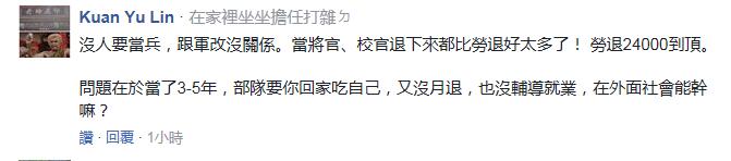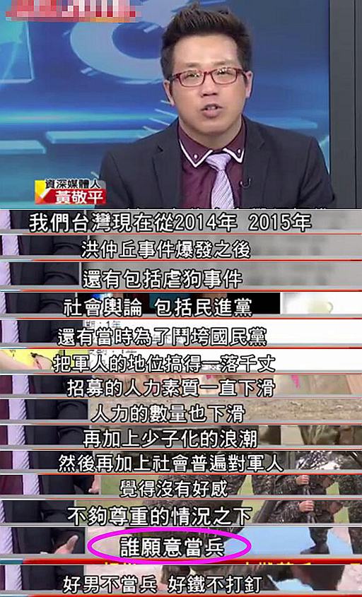 其實,不怪臺灣民眾排斥當兵,且不說有重創軍人利益的年改,蔡英文當局對待軍人的態度也令人不齒,“有事軍人干,沒事干軍人”的做事風格不僅傷了臺灣士兵的心,也讓島內民眾對當兵一事避之不及,臺灣資深媒體人黃敬平更用“好男不當兵,好鐵不打釘”形容全臺民眾現今對當兵一事的態度。