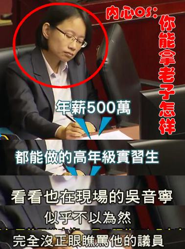 也正是因為有這樣的后臺,吳音寧本人才會不管是在面對記者質疑或議員指責時,都能擺出一副老神在在的態度,反正有人會替她“背書”: