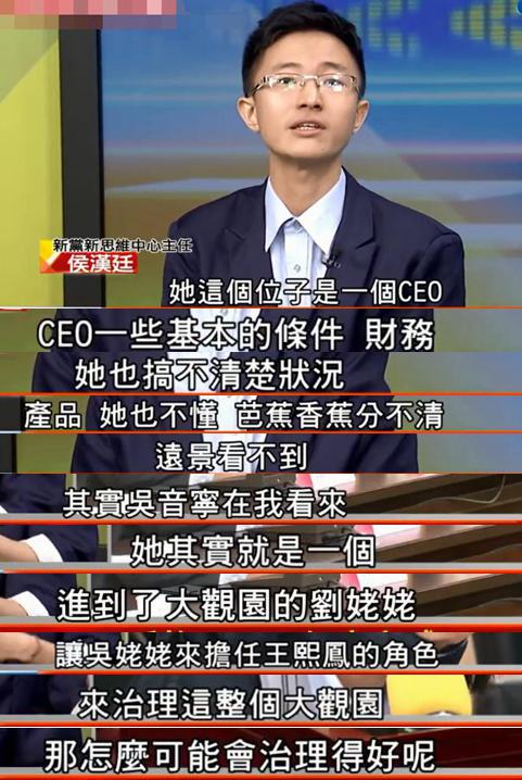 新黨新思維中心主任侯漢廷對此也直言,如今在位的吳音寧其實就是一個“進了大觀園的劉姥姥”!
