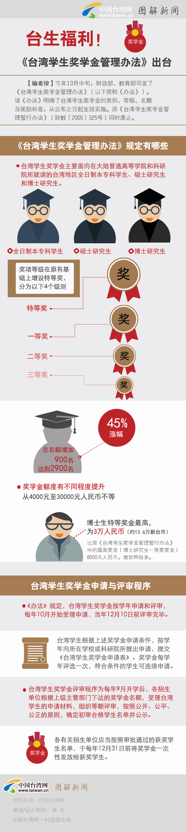 【編者按】今年10月中旬,財政部、教育部印發(fā)了《臺灣學(xué)生獎學(xué)金管理辦法》(以下簡稱《辦法》)。該《辦法》明確了臺灣學(xué)生獎學(xué)金的類別、等級、名額及獎勵標(biāo)準,從公布之日起生效實施。原《臺灣學(xué)生獎學(xué)金管理暫行辦法》(財教〔2005〕325號)同時廢止。