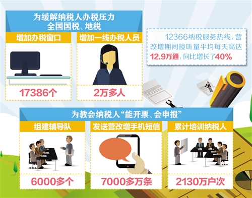 這只是營改增“放管服”中的一個(gè)縮影。數(shù)據(jù)顯示,為緩解納稅人辦稅壓力,全國國稅、地稅增加辦稅窗口17386個(gè)、一線辦稅人員2萬多人。同時(shí),為教會(huì)納稅人“能開票、會(huì)申報(bào)”,組建輔導(dǎo)隊(duì)6000多個(gè),發(fā)送營改增手機(jī)短信7000多萬條,累計(jì)培訓(xùn)納稅人2130萬戶次,實(shí)現(xiàn)了納稅人培訓(xùn)全覆蓋。據(jù)統(tǒng)計(jì),12366納稅服務(wù)熱線在營改增期間的接聽量,平均每天高達(dá)12.9萬通,同比增長了40%。