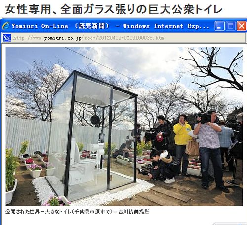 在市原市的小湊鐵道公司的飯給火車站前,有一塊用杉樹干密集圍成的、面積約200平方米的空地。如果沒人介紹,誰也想象不出,這里面竟是一個女性專用廁所。如今,人們看到,空地中央安放了一個1.4平方米的單間式廁所,廁所的墻壁全部采用通亮的玻璃。坐在里面,可以看到遍布四周的五顏六色的盆栽鮮花。而且,從外面也能一覽廁所內部如廁人的一舉一動。玻璃廁所的設計者藤本壯介介紹稱,建造它是“希望使用者即使是在個人的方便空間也能欣賞到美麗的風景”。