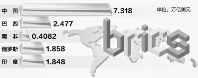 據(jù)統(tǒng)計(jì),金磚國(guó)家總?cè)丝诩s占世界總?cè)丝诘?2%。2011年,國(guó)內(nèi)生產(chǎn)總值合計(jì)約為13.9萬億美元,占世界總量的19.86%。圖為金磚國(guó)家2011年國(guó)內(nèi)生產(chǎn)總值。 (數(shù)據(jù)來源:世界銀行 制圖:蔡華偉)