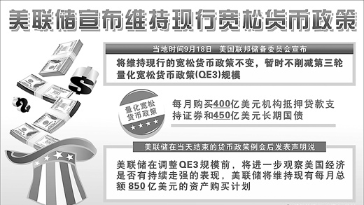 正當外界普遍預計本月起量化寬松政策將逐步收縮之際,美國聯邦儲備委員會9月18日在結束貨幣政策例會后宣布,將維持現行的寬松貨幣政策不變,暫時不削減第三輪量化寬松貨幣政策(QE3)規模。美聯儲稱,在削減資產購買步伐前,需看到更多的證據顯示經濟和就業市場的改善是可持續的。
