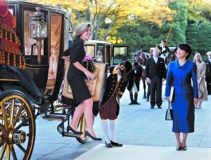 遞交國(guó)書儀式于當(dāng)?shù)貢r(shí)間下午3時(shí)10分,在皇宮廣場(chǎng)前的明治館舉行。卡羅琳乘坐仿古馬車前往皇宮,在沿途近萬人的夾道歡呼和注目之下,經(jīng)過二重橋進(jìn)入皇宮。