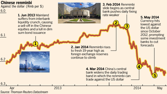 今年3月,中國當局將人民幣每日交易區間擴大到中間價上下2%的范圍。這兩種政策的共同作用,引導著人民幣匯率走低,并賦予其以更快速度下行的自由。