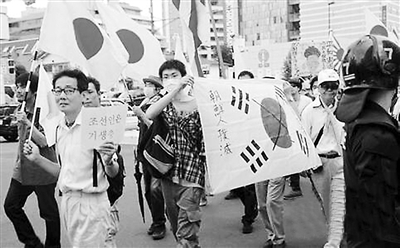 2013年6月16日,日本極右團(tuán)體成員在東京“韓國(guó)城”舉行種族主義排外示威。來源:新華網(wǎng)