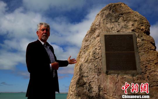 龍蝦鎮鎮長彼得·萊斯利站在一塊為紀念約160年前大批中國淘金客登陸的碑前表達了對當年盛況的緬懷。 賴海隆 攝